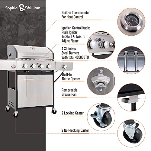 Details: Sophia & William BBQ Propane Gas GrillThis sophia & william 4-Burner Gas Grill with Side Burner is crafted from 304 stainless steel and porcelain-enameled materials. With 542 sq. in. of total cooking space this BBQ offers enough space to cook for small gatherings or large parties. Its even heat cooking system includes stainless steel burners, porcelain-enamel flame tamer and enhanced grates that work together to distribute consistent heat across the entire cooking surface and to reduce grill flare-ups. Make your next grill.FeaturesDurable, easy-to-clean porcelain-enameled iron grates provide superior heat retention and distributes even heat, preventing hot or cold spots on grates. Porcelain-enamel finish helps prevent rusting and cracking.Warming rack keeps food warm off the main grate for extra space.Stainless steel side shelves offers a convenient prep area.Built-in thermometer for heat control.Stainless steel double walled Lid for improved strength and durability.Twist to start and ignition control knobs.Once you're wrapped up, the grease cup is easy to remove and empty out.Built-in bottle opener.2 Galvanized locking casters & 2 Galvanized non-locking caster for easy fix and transport.Propane gas grill works with standard 20 lb LP tank(not included). Hose & regulator are included.Assembly required with detail instructions.Product DetailsColor: silverMaterial: 304 stainless steel burner, lid,body + porcelain-enameled grates, warm racing,flame tamerStyle: cabinet StyleDimensions: 21.8" D x 51" W x 42.3" HWeight: 80 lbsTotal BTU: 42,000Total cooking area: 542 sq. in.Number of main burners: 4 burnerGrill fuel type: propanePackage Included:1 x Gas grillHose & regulator1 x Waterproof cover1 x Assembly instruction